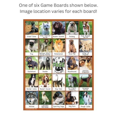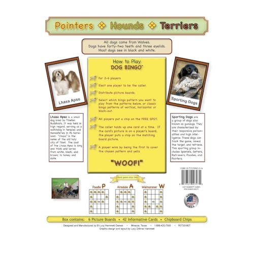 Dog Bingo offers an educational and fun twist on the classic bingo game. Each set includes 6 unique Picture Boards, 42 informative Cards, and Bingo chips. This game focuses on fascinating facts about various dog breeds. Each calling card features vibrant color images on the front and informative facts on the back, making learning an interactive experience. Suggestions for different ways to play are included on the back of each box, adding versatility to the traditional bingo game. Suitable for all ages, Dog Bingo is made in the USA and promises hours of educational entertainment.